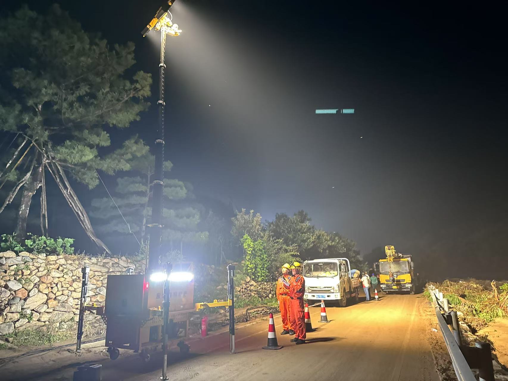 国网山东应急救援队为莱芜“7·22”山洪灾害应急抢险电缆施放现场提供照明。宫梓超/摄