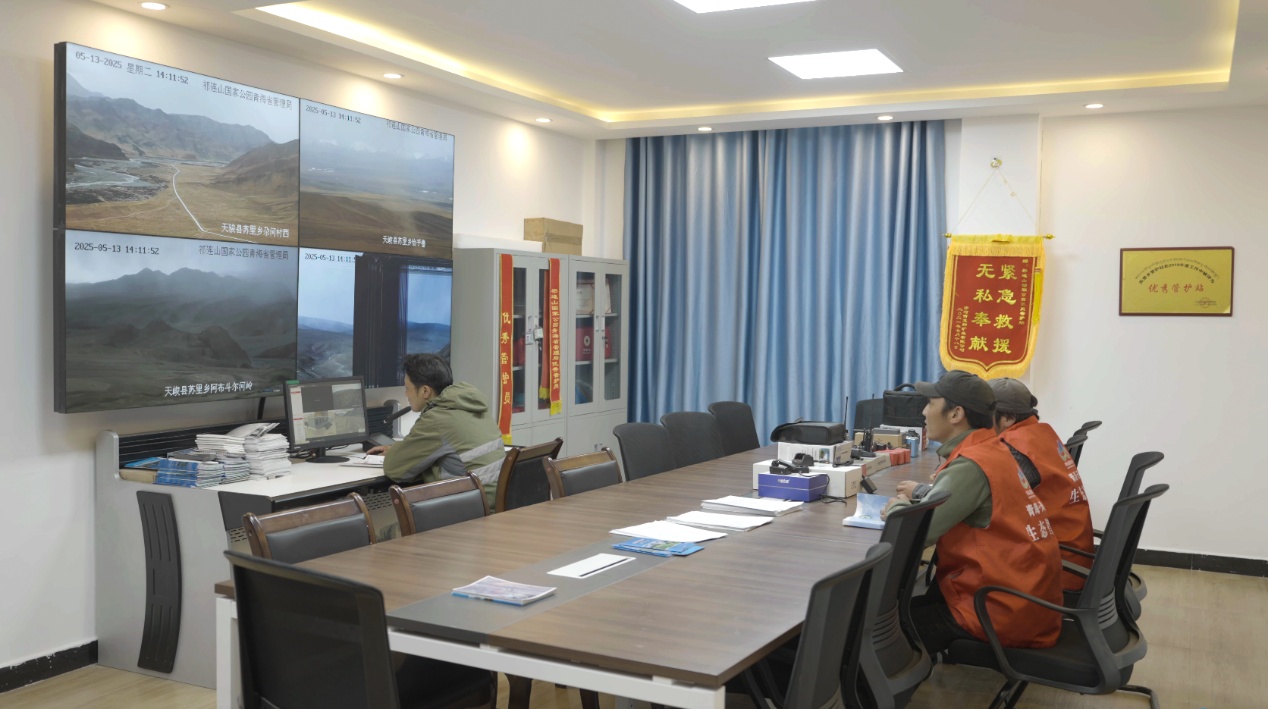 管护员多不丹在祁连山国家公园苏里管护站,通过LED电子屏监测生态环境。许小萍/摄