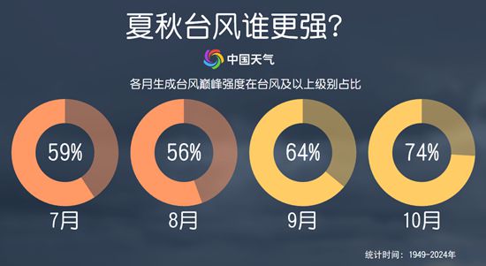 虽然夏季台风的生成数量是一年中最多的,但从各台风的巅峰强度来看,秋台风的实力更胜一筹。1949年至2024年数据显示,7月和8月的台风,巅峰强度在台风及以上级别占比不足60%(在当月台风总数中的占比),而9月和10月台风的巅峰强度达到台风及以上级别的占比都超过60%,其中10月高达74%。