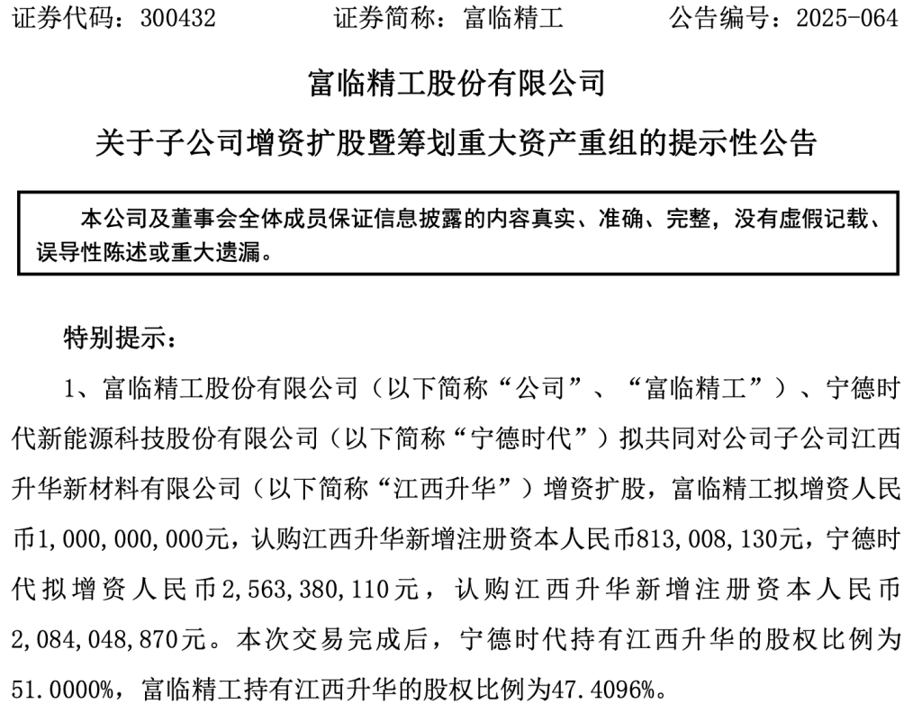 9月29日晚间,磷酸铁锂头部企业富临精工(300432.SZ)公告披露,公司和宁德时代拟共同对子公司江西升华新材料有限公司(下称“江西升华”)增资扩股,富临精工拟增资人民币1000000000元,认购江西升华新增注册资本人民币813008130元,宁德时代拟增资人民币2563380110元,认购江西升华新增注册资本人民币2084048870元。