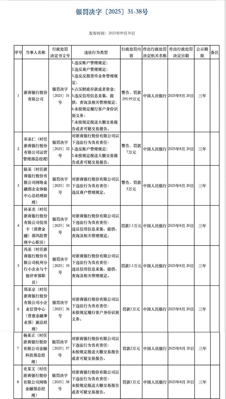 9月30日,中国人民银行行政处罚公示显示,浙商银行被警告并处罚款295.99万元,涉及的违法行为类型包括:违反账户管理规定;违反商户管理规定;违反反假货币业务管理规定;占压财政存款或者资金;违反信用信息采集、提供、查询及相关管理规定;未按规定履行客户身份识别义务;未按规定报送大额交易报告或者可疑交易报告。作出行政处罚的决定日期为8月20日。