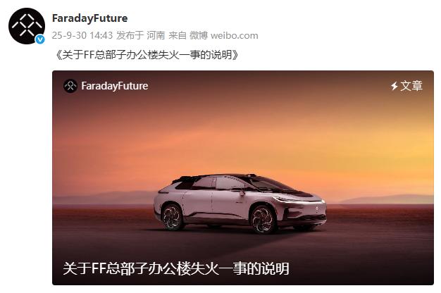 9月30日,法拉第未来 @FaradayFuture 发布关于FF总部子办公楼失火一事的说明:美西时间9月28日周日凌晨,FF美国总部的一栋子办公楼发生了失火。失火未造成任何人员受伤,且公司总部目前运营一切正常;楼内的一台FF 91展车起火,但该办公楼墙面有轻微损伤,但玻璃全部完好;公司已经与有关部门合作,调查失火原因。