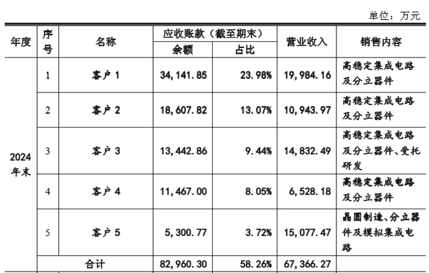燕东微应收账款周转率偏低与业务结构有一定关系。截至2024年底,公司应收账款排名前五的客户中,有四个销售内容为高稳定集成电路及分立器件,这类客户通常为特种行业客户,回款周期较长。