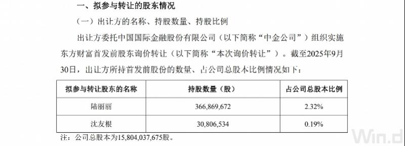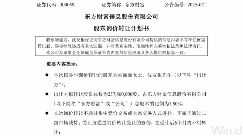 9月30日晚间,东方财富(300059.SZ)发布公告称,股东陆丽丽、沈友根拟通过询价转让方式转让2.38亿股股份,占公司总股本的1.50%。转让原因为个人资金需求。