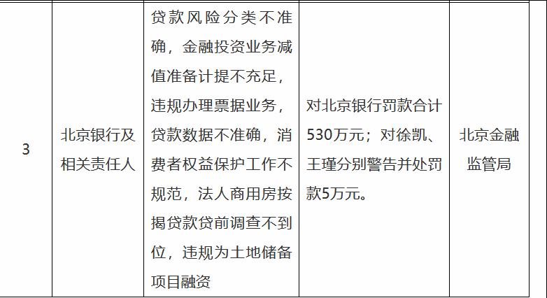 9月30日,国家金融监督管理总局北京监管局行政处罚信息公开表,北京银行因多达七项违法违规行为合计被罚530万元,责任人徐凯、王瑾被警告并处罚款5万元。