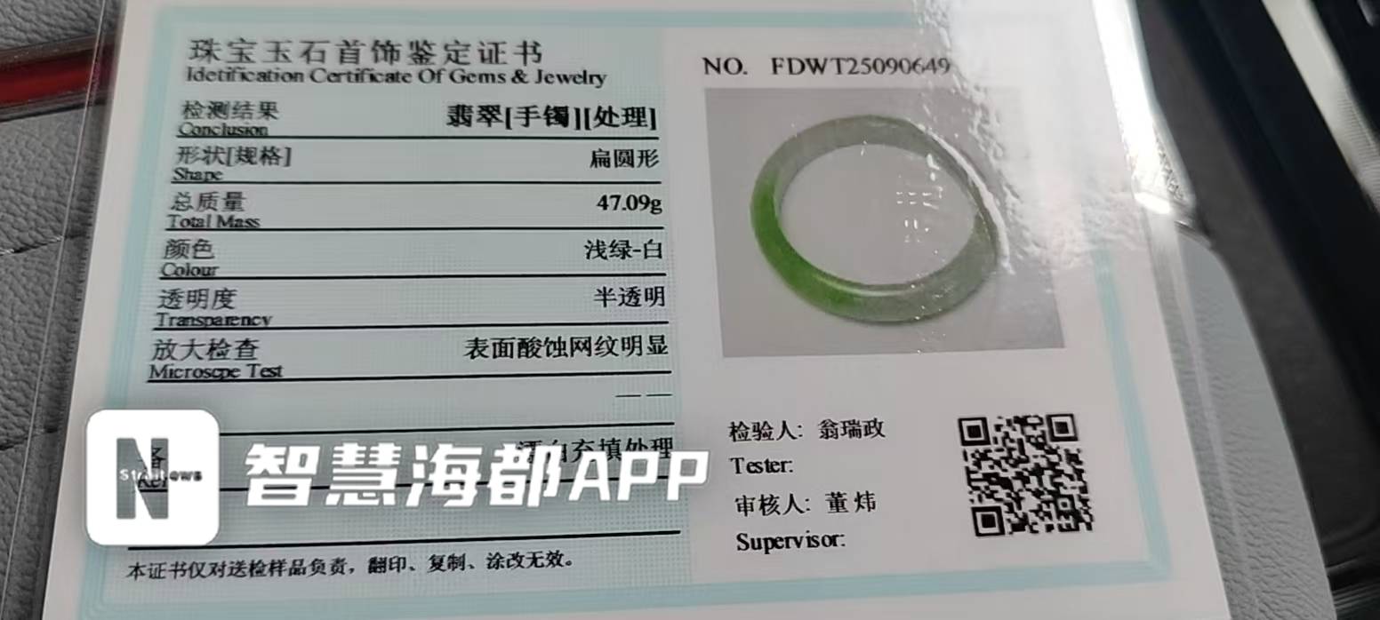9月初,程女士找到了福州戴信珠宝检测有限公司,检测报告显示“两件首饰表面酸蚀网纹明显、有漂白充填处理”。记者咨询了福建省宝玉石协会相关工作人员,确认该珠宝检测公司鉴定结果可信。“这是什么意思,花了近2000元却买到假货了吗?”程女士难以接受,多次联系两个摊主,要求作出解释并退回费用,至今没有得到回应。