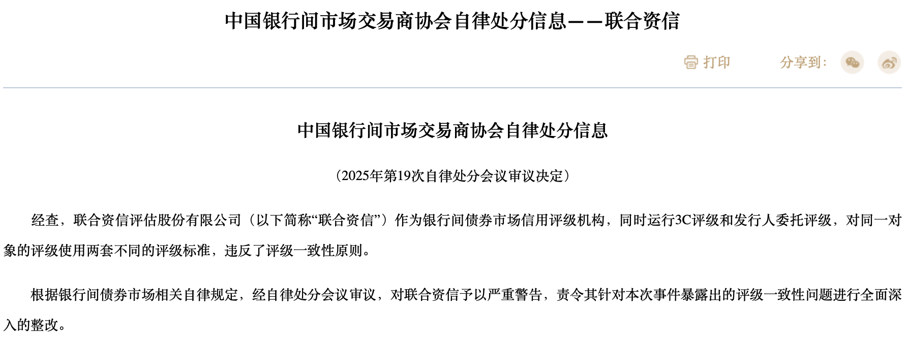 8月28日,据中国银行间市场交易商协会,联合资信评估股份有限公司(下称“联合资信”)作为银行间债券市场信用评级机构,同时运行3C评级和发行人委托评级,对同一对象的评级使用两套不同的评级标准,违反了评级一致性原则。中国银行间市场交易商协会对联合资信予以严重警告,责令其针对本次事件暴露出的评级一致性问题进行全面深入的整改。