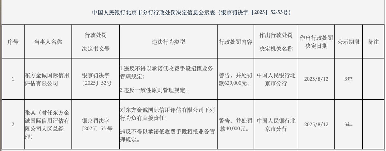 8月15日,中国人民银行北京市分行披露的行政处罚决定信息公示表显示,东方金诚国际信用评估有限公司(下称“东方金诚”)被警告并处罚款62.9万元,涉及的违法行为类型包括:违反不得以承诺低收费手段招揽业务管理规定;违反一致性原则管理规定。同时,有一名责任人被警告并处罚款4万元。作出行政处罚的决定日期为8月12日。