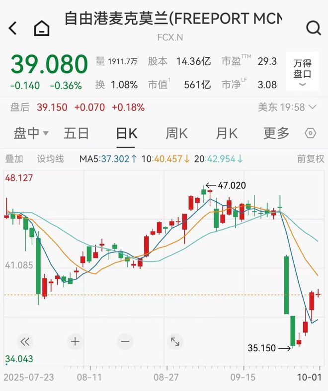 截至10月1日收盘,自由港公司股价报39.08美元/股。