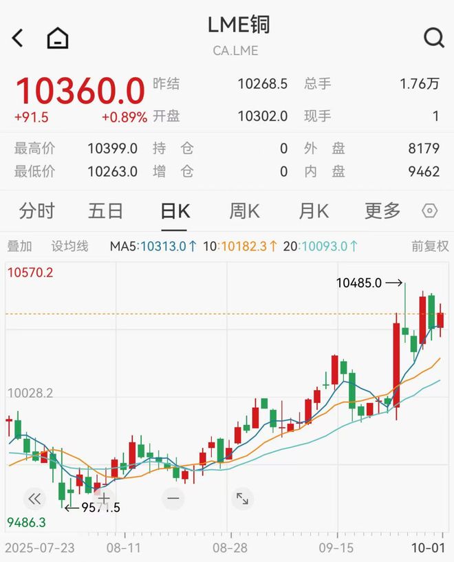 日前,印尼Grasberg矿山因泥石流事故宣布停产,铜价随即开启猛涨行情。10月1日,LME伦铜最新报10360美元/吨。此前,LME伦铜在9月25日一度触及10485美元/吨。