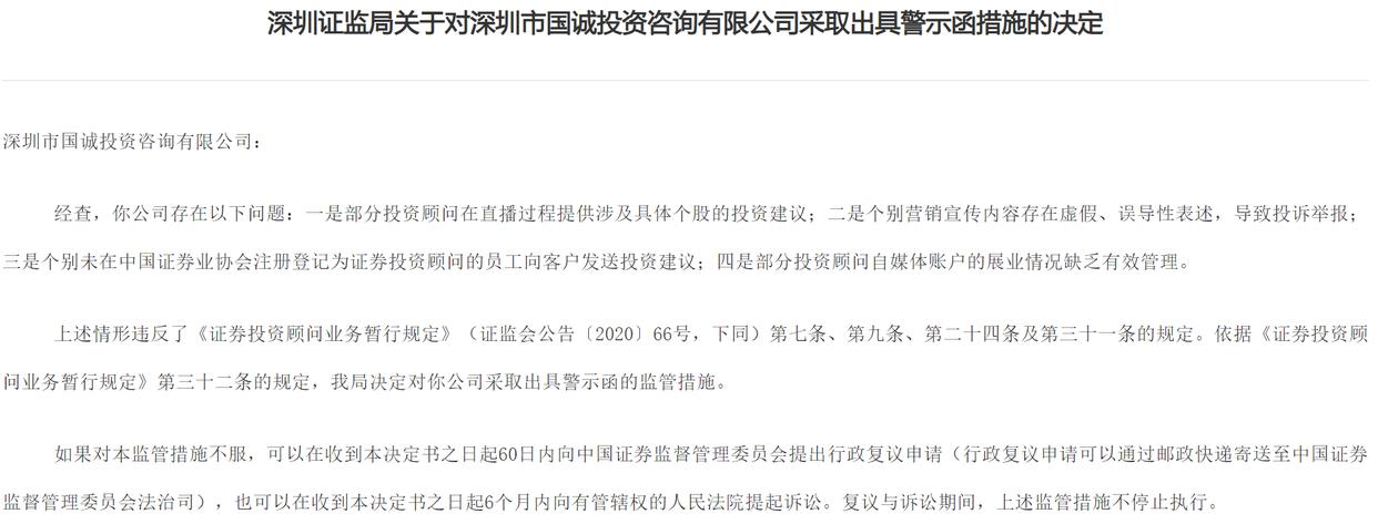经查,深圳市国诚投资咨询有限公司存在以下问题:一是部分投资顾问在直播过程提供涉及具体个股的投资建议;二是个别营销宣传内容存在虚假、误导性表述,导致投诉举报;三是个别未在中国证券业协会注册登记为证券投资顾问的员工向客户发送投资建议;四是部分投资顾问自媒体账户的展业情况缺乏有效管理。