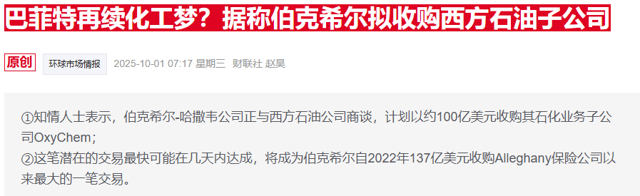 本周早些时候,财联社报道就已经提到,伯克希尔计划以约100亿美元收购OxyChem。据了解,OxyChem主营医疗保健、食品安全及建筑领域的化工产品。