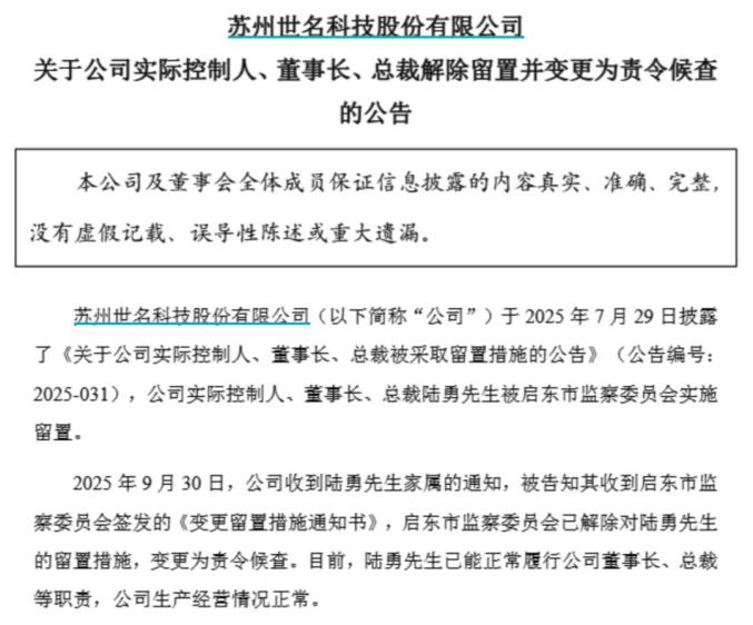 近日,世名科技盘后公告,9月30日公司收到公司实际控制人、董事长、总裁陆勇家属的通知,被告知其收到启东市监察委员会签发的《变更留置措施通知书》,启东市监察委员会已解除对陆勇的留置措施,变更为责令候查。目前,陆勇已能正常履行公司董事长、总裁等职责,公司生产经营情况正常。