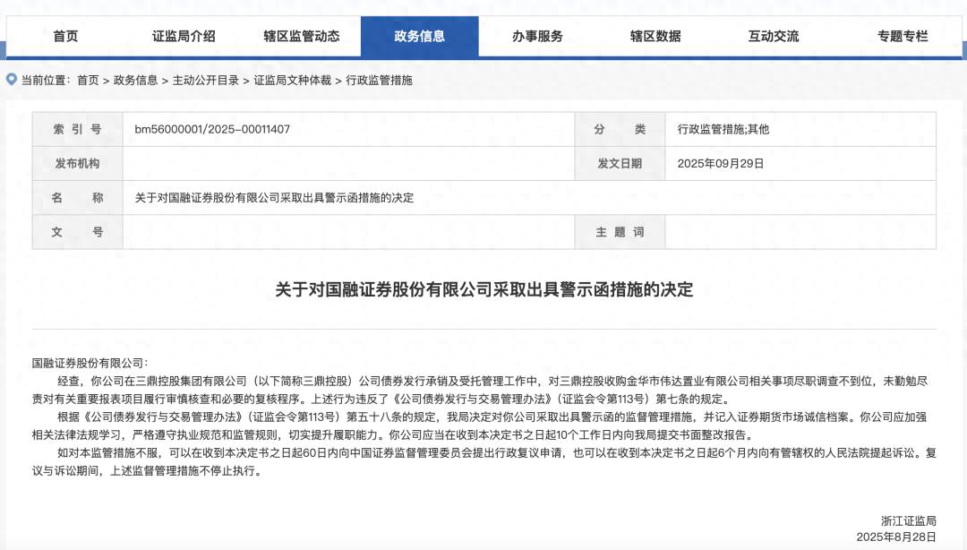 根据《公司债券发行与交易管理办法》(证监会令第113号)第五十八条的规定,浙江证监局决定对国融证券股份有限公司采取出具警示函的监督管理措施,并记入证券期货市场诚信档案。