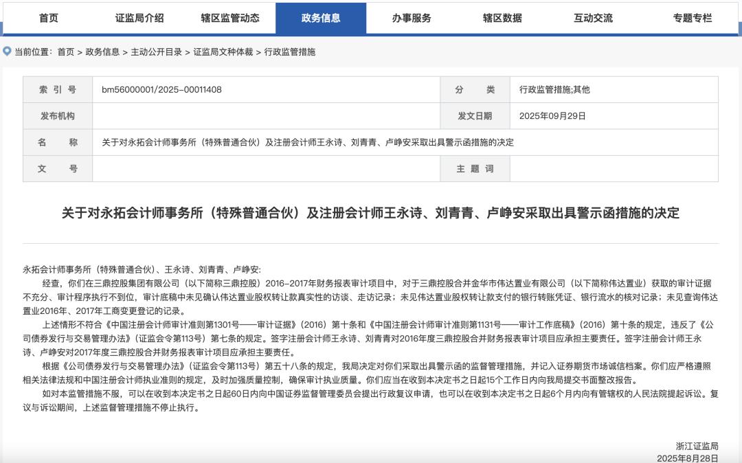 同时,浙江证监局还指出,永拓会计师事务所及注册会计师王永诗、刘青青、卢峥安在三鼎控股2016年~2017年财务报表审计项目中,对于三鼎控股合并金华市伟达置业有限公司(以下简称伟达置业)获取的审计证据不充分、审计程序执行不到位,审计底稿中未见确认伟达置业股权转让款真实性的访谈、走访记录;未见伟达置业股权转让款支付的银行转账凭证、银行流水的核对记录;未见查询伟达置业2016年、2017年工商变更登记的记录。