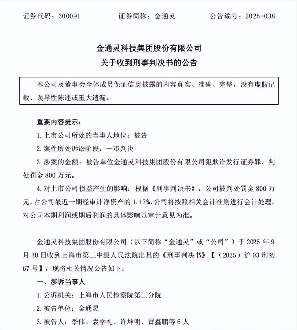 9月30日,金通灵收到的《刑事判决书》显示,上海市第三中级人民法院(以下简称法院)一审判决被告单位金通灵犯欺诈发行证券罪,判处罚金800万元。