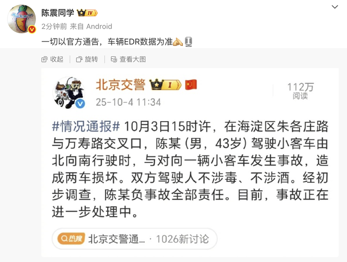 10月4日,@北京交警 发布情况通报:10月3日15时许,在海淀区朱各庄路与万寿路交叉口,陈某(男,43岁)驾驶小客车由北向南行驶时,与对向一辆小客车发生事故,造成两车损坏。双方驾驶人不涉毒、不涉酒。经初步调查,陈某负事故全部责任。目前,事故正在进一步处理中。随后,汽车博主陈震转发该通报,并表示:“一切以官方通告,车辆EDR数据为准。”