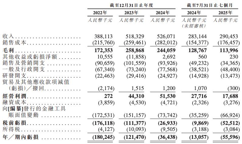 财报数据显示,2022年~2024年及2025年前7个月(以下称报告期),公司的收入分别为3.88亿元(人民币,下同)、5.18亿元、5.26亿元及2.91亿元。不难发现,相较于2023年快速增长33.5%而言,2024年同比增速已显著放缓至1.5%。