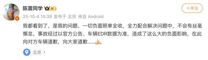 10月4日下午,汽车博主陈震在微博发文就车祸事件道歉:“我都看到了,是我的问题,一切负面照单全收,全力配合解决问题中,不会有丝毫懈怠,事故经过以官方公告、车辆EDR数据为准,造成了这么大的负面影响,在此向对方车辆道歉,向大家道歉…… ”
