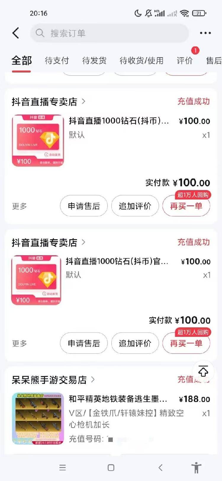 曹先生儿子在抖音打赏直播与购买游戏装备的部分订单。受访者供图