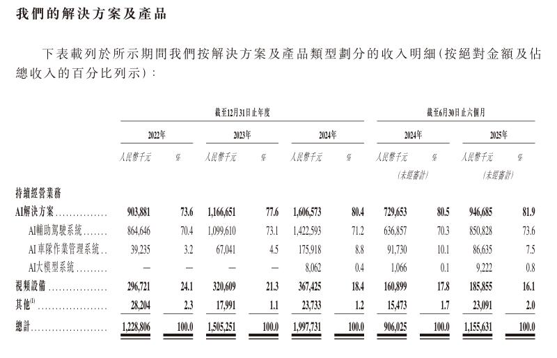公司称,于往绩记录期间,公司产生的收入主要来自AI辅助驾驶系统、AI车队作业管理系统及视频设备。2024年6月,公司开始从AI大模型系统产生收入,AI大模型系统主要通过公司的云平台以软件形式交付。