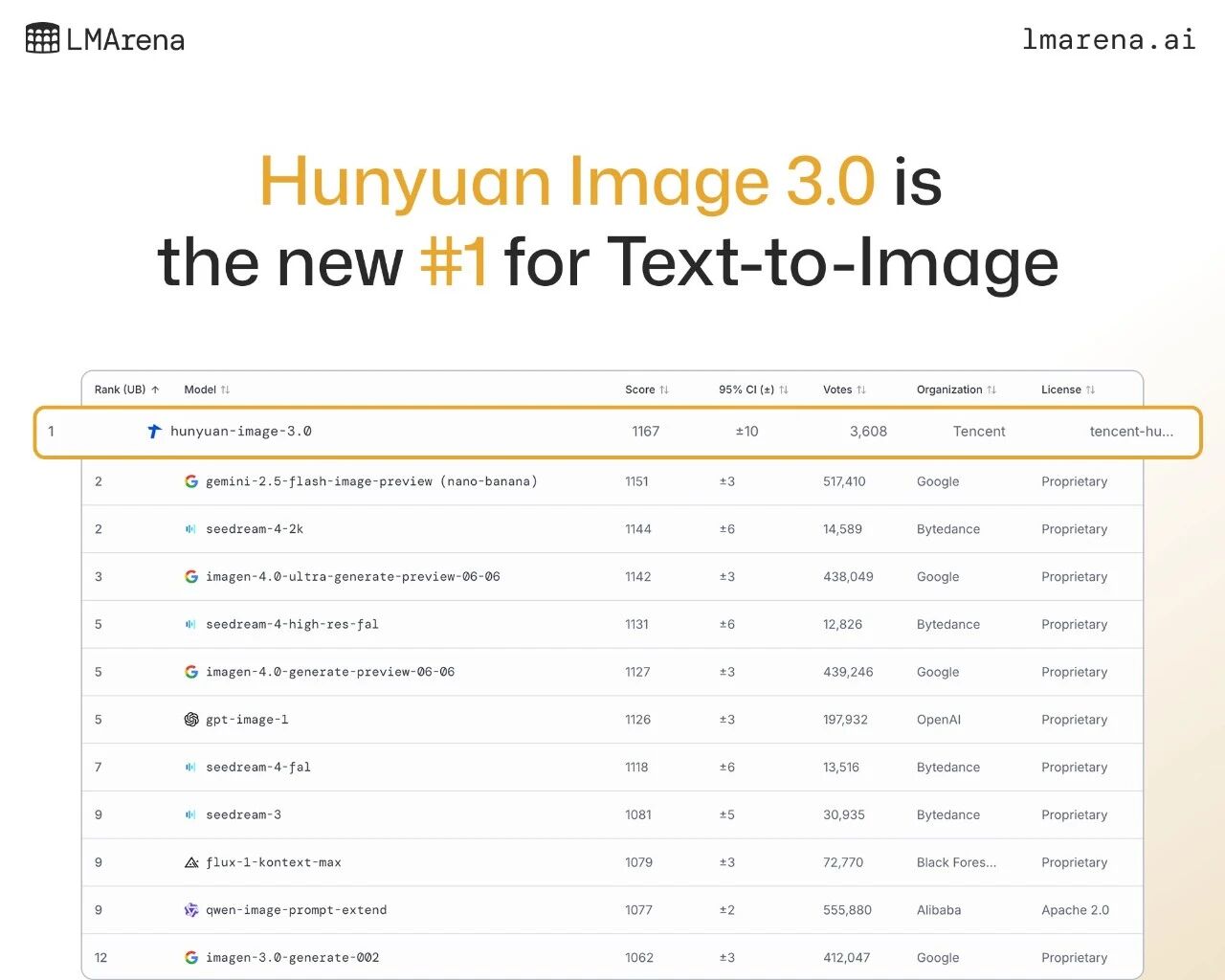 国庆假期过半,大厂们的AI争霸赛并未因假期停歇。今日,腾讯宣布,其发布仅一周的混元图像3.0,在文生图领域的“权威竞技场”LMArena中,从全球26个大模型里突围,登顶第一,成为目前效果最好的开源生图模型,效果可对标业界头部闭源模型。腾讯混元团队透露,混元图像3.0目前的版本仅开放了文生图能力,图生图、图像编辑、多轮交互等版本将于后续发布。