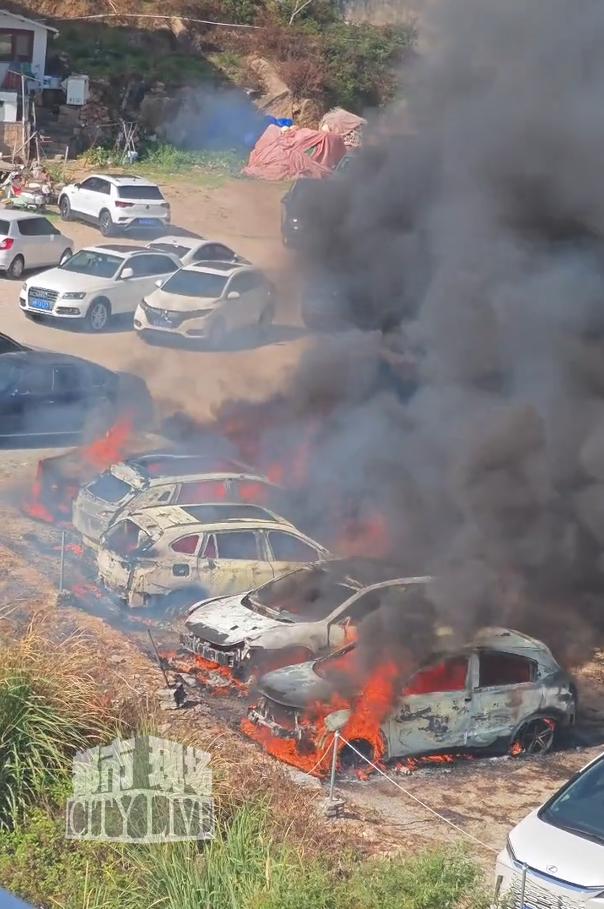 据网友拍摄的现场视频显示,10月5日14时20分许,东壁村一处空地上,一辆悬挂绿色号牌的新能源汽车首先起火,火势迅速蔓延,浓烟滚滚。约半小时后,火势波及周边车辆,多辆车被烧至仅剩车架。16时30分左右,当地消防及公安部门抵达现场开展救援。