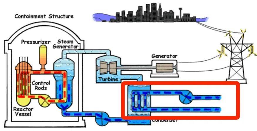 水蒸气在完成推动汽轮机的任务之后并不是直接排走了,而是需要重新冷却成液态水,然后再次进行这个循环。而将水蒸气重新冷却成液态水的过程就需要大量的冷却水。