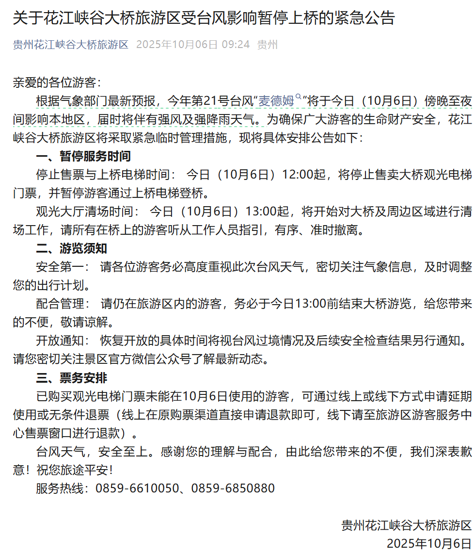根据气象部门最新预报,今年第21号台风“麦德姆”将于今日(10月6日)傍晚至夜间影响本地区,届时将伴有强风及强降雨天气。为确保广大游客的生命财产安全,花江峡谷大桥旅游区将采取紧急临时管理措施。