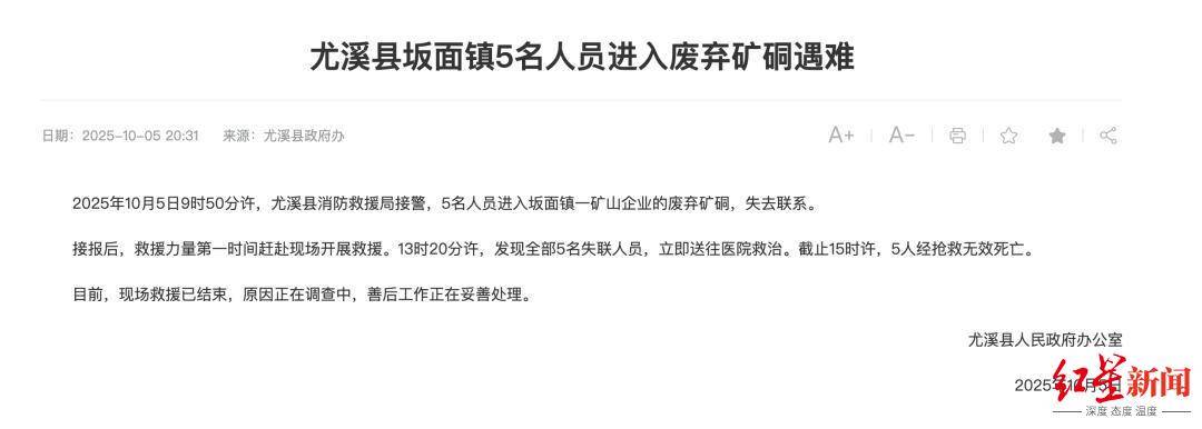 据福建省三明市尤溪县政府通报,10月5日,5名人员进入该县坂面镇一矿山企业的废弃矿硐后失联,救援力量迅速赶赴现场将5名失联人员救出,但5人经抢救无效死亡。目前,现场救援已结束,原因正在调查中,善后工作正在妥善处理。