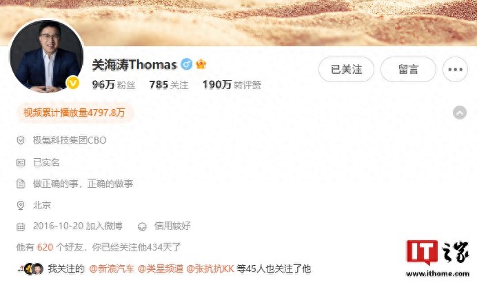 10 月 6 日消息,原极氪智能科技 CMO 关海涛现已更改了自己的微博昵称(原:@极氪关海涛;现:@关海涛 Thomas),其微博身份认证也变更为极氪科技集团 CBO。
