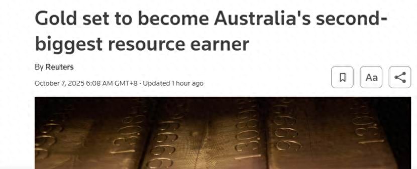 澳大利亚工业部在9月季度报告中称,预计在截至2026年6月的当前财年,澳大利亚黄金出口额将增加120亿澳元(79亿美元),达到600亿澳元,原因是该国黄金出口量增加且价格上涨。