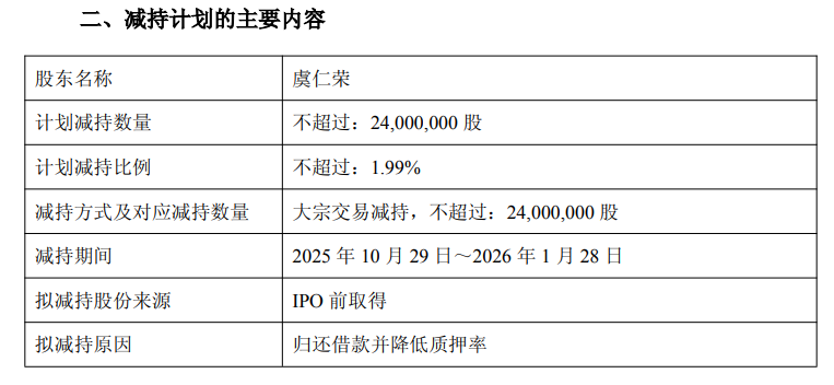 据公告,虞仁荣目前持有公司股份333,472,250股,占公司目前总股本的27.65%。虞仁荣所持上述股份来源于公司首次公开发行股票前已取得的股份。