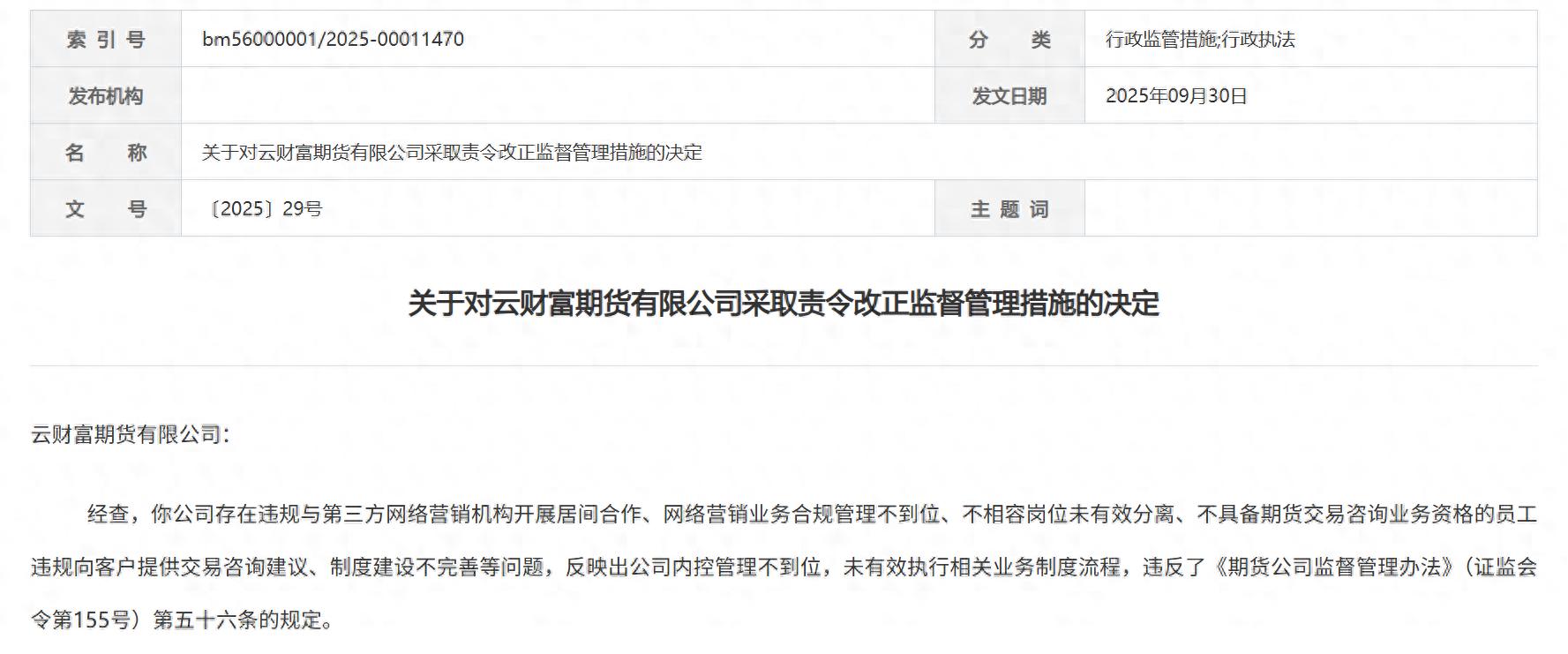 近日,新疆证监局发布的行政监管措施公告显示,云财富期货有限公司被责令改正。