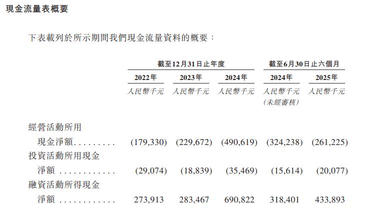 招股书还显示,公司现金流较为紧张。2022-2024年及2025年上半年,公司经营活动所用现金净额均为净流出,分别为-1.79亿元、-2.29亿元、-4.90亿元、-2.61亿元。而且,2022-2024年,公司现金流出呈持续扩大(恶化)趋势。
