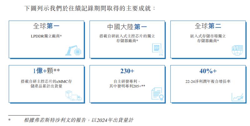 招股书称,面向AI全域变革,公司为上述终端设备的全面AI化转型升级提供存储应用技术的赋能,为AI手机、AI PC、机器人及智能座舱系统等跨时代产品落地提供富有市场竞争力的存储方案。公司专注于存储应用技术的研发与创新,已经成功研发出包括闪存主控芯片设计技术、存储颗粒分析技术、产品设计及先进封装设计技术、固件技术及高效测试技术等核心技术。公司凭藉领先的技术研发创新能力、安全强韧的供应链生态、品质至上的生产管理体系、敏捷高效的客户服务水平,持续保持行业领先地位。