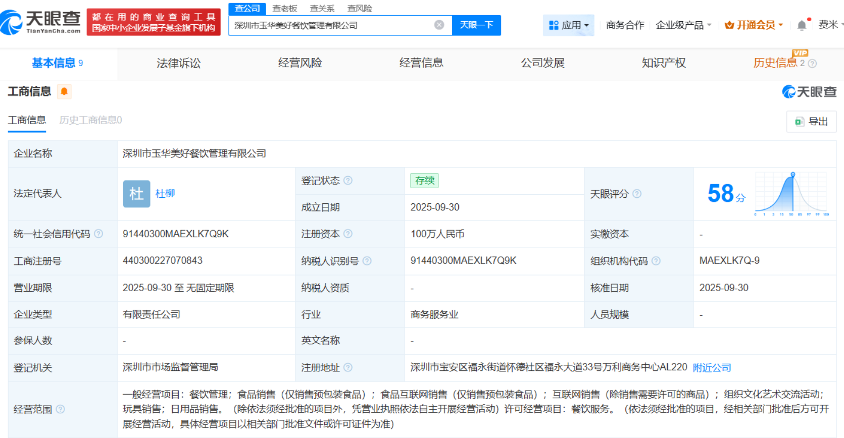 天眼查App显示,近日,深圳市玉华美好餐饮管理有限公司成立,法定代表人为杜柳,注册资本100万人民币,经营范围包括餐饮管理、食品销售、互联网销售等。股东信息显示,该公司由内蒙古西贝餐饮集团有限公司、深圳市本康美好餐饮管理合伙企业(有限合伙)共同持股。