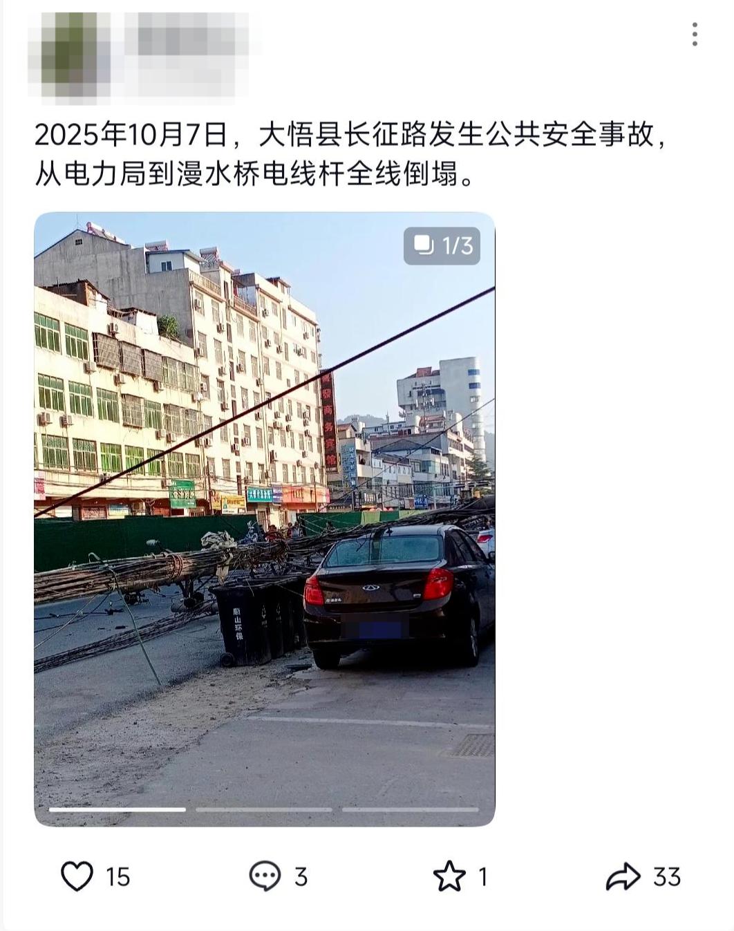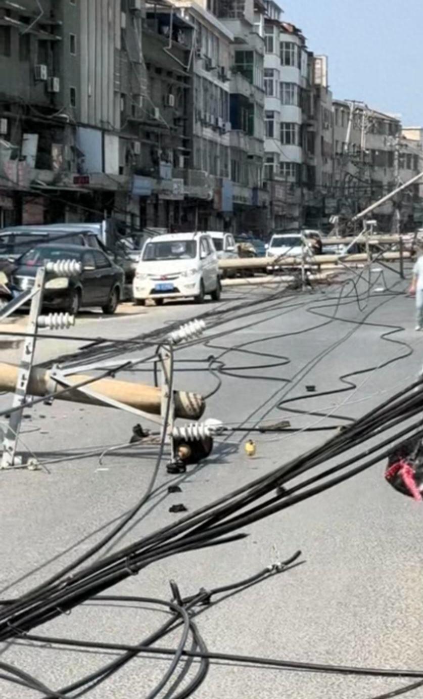 10月7日,短视频平台上多位网民发布信息称,湖北省孝感市大悟县一处街道上多根电线杆倒塌。