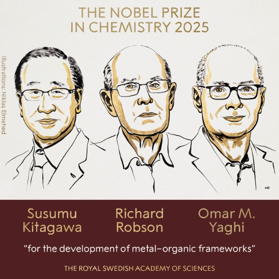 当地时间10月8日,瑞典皇家科学院决定将2025年诺贝尔化学奖授予北川进(Susumu Kitagawa)、理查德·罗布森(Richard Robson)以及奥马尔·M·亚吉(Omar M. Yaghi)三位科学家,以表彰其在金属有机骨架开发领域的贡献。