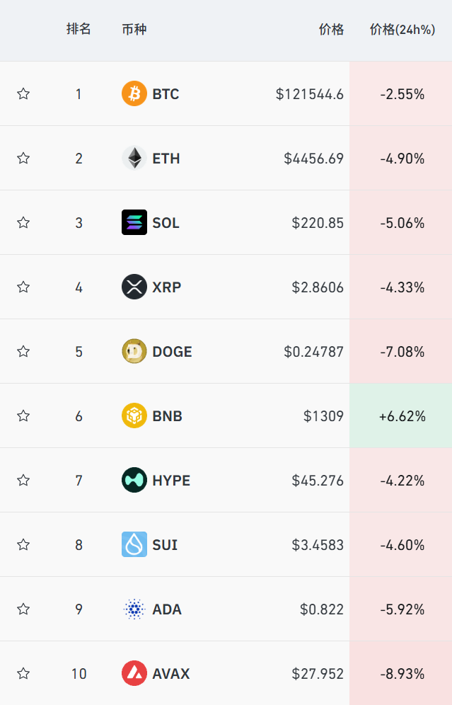 主流加密货币集体走低,AVAX跌近9%,DOGE跌超7%,ETH跌近5%。不过,BNB异军突起,涨超6%。