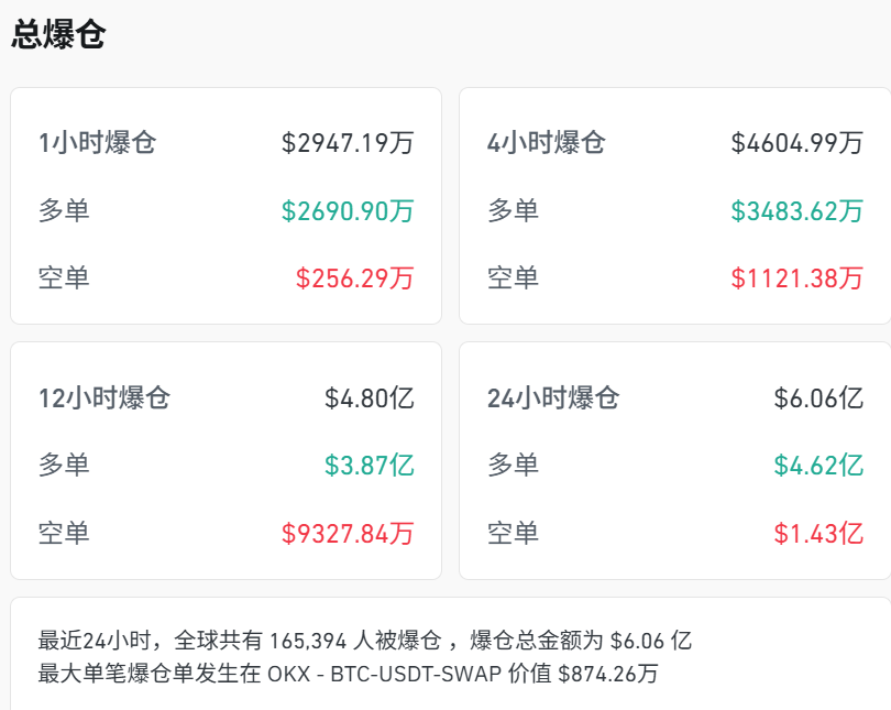 CoinGlass数据显示,最近24小时,全球共有165,394人被爆仓,爆仓总金额为6.06亿美元。其中,最大单笔爆仓单发生在OKX-BTC-USDT-SWAP,价值达874.26万美元。