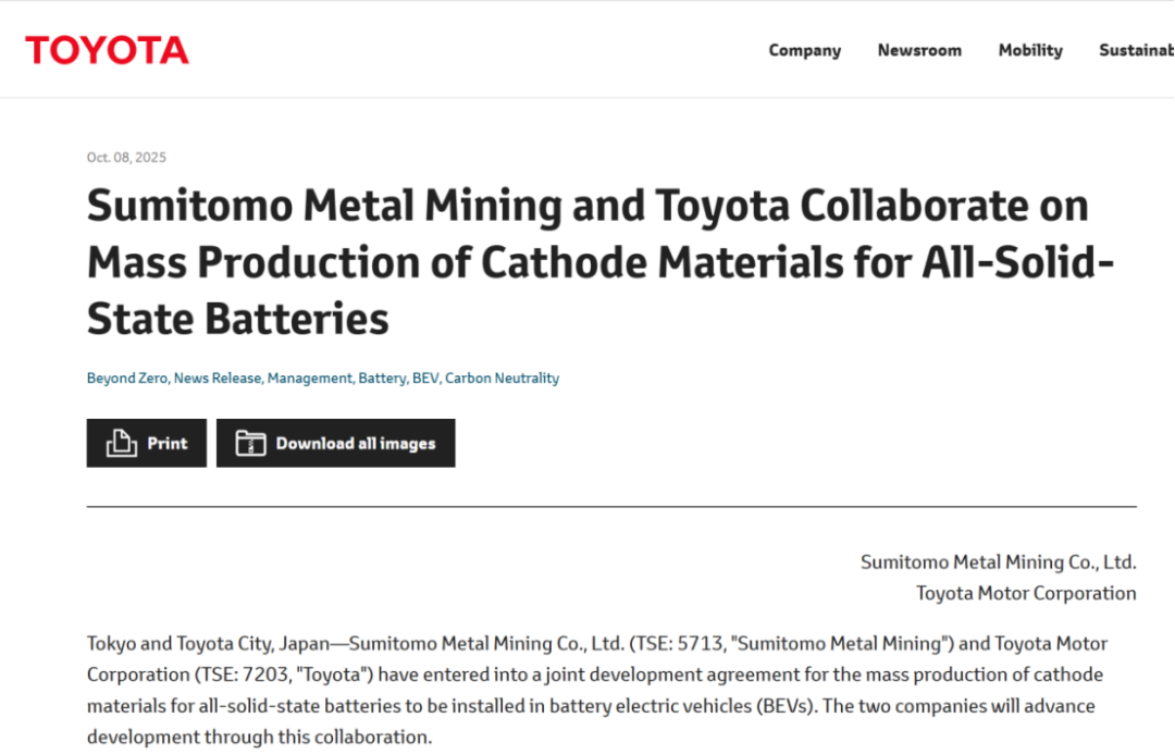 10月8日,丰田汽车全球官网发布消息称,住友金属矿山株式会社(以下简称“住友金属矿山”)与丰田汽车就量产用于纯电动汽车(BEV)的全固态电池正极材料达成合作协议。双方将通过此次合作推进研发进程。丰田汽车还在文内重申,计划于2027年至2028年间推出搭载全固态电池的纯电动汽车。