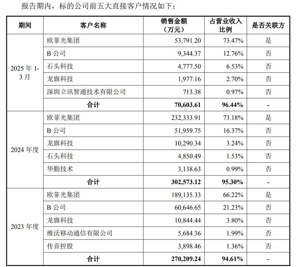 财务数据显示,标的公司欧菲微电子存在客户集中度较高的风险。2023年、2024年和2025年一季度,将上市公司及其子公司从标的公司采购后未经加工直接对外销售部分的产品穿透至外部客户后,标的公司对穿透后前五大客户的销售额占营业收入的比例分别为79.40%、78.30%、79.29%,主要包括国际国内头部智能手机品牌厂商等。而报告期内欧菲光均为欧菲微电子第一大直接客户,销售占比分别为66.22%、73.18%、73.47%。
