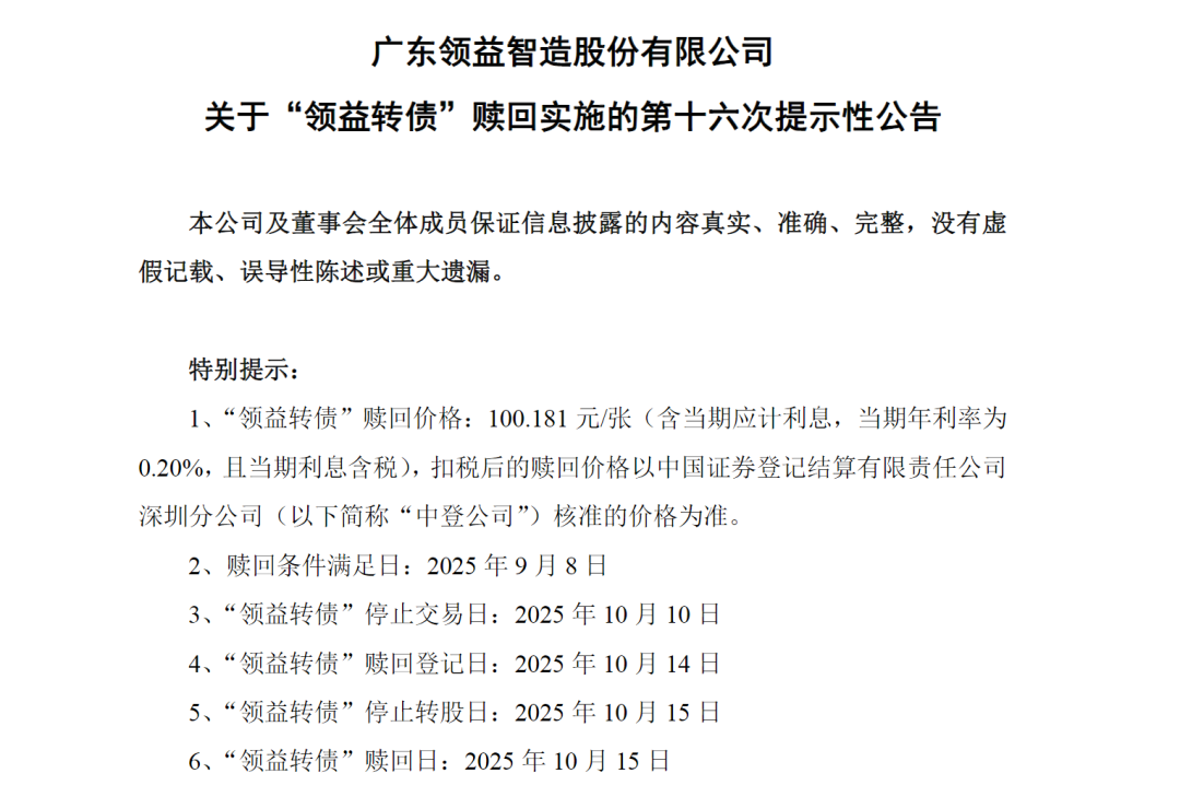 领益智造于节前发布关于“领益转债”赎回实施的第十六次提示性公告,提醒投资者领益转债将于10月10日停止交易,于10月15日停止转股。10月14日收市后,仍未转股的“领益转债”将按照100.181元/张的价格强制赎回。