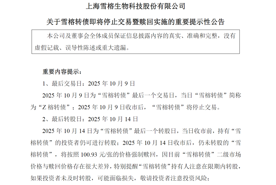 雪榕生物于近日发布关于雪榕转债即将停止交易暨赎回实施的重要提示性公告,提醒投资者10月9日为雪榕转债最后一个交易日,10月14日是最后一个转股日,债券持有人应及时卖出或转股。10月14日收市后,未实施转股的雪榕转债将全部冻结,停止交易和转股。