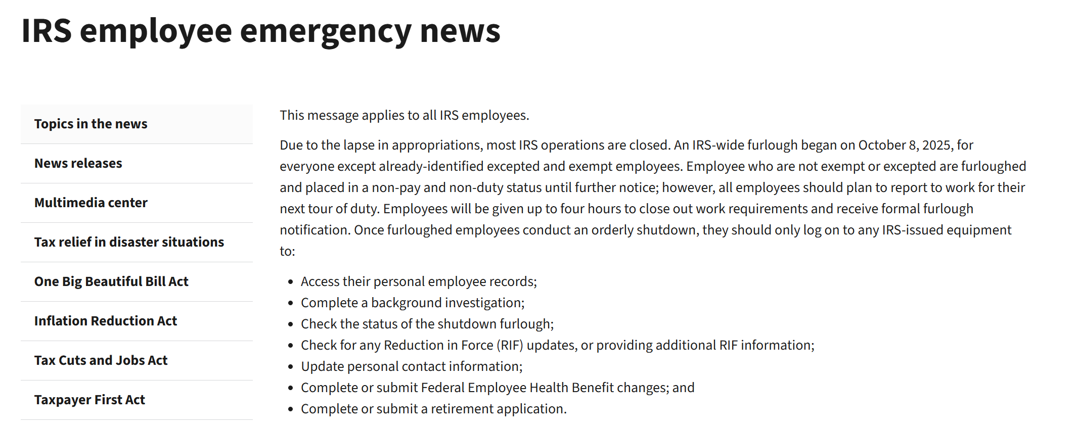 美国国税局官网周三挂出告示,宣布由于国会依然未就临时拨款法案达成一致,覆盖整个国税系统的停薪停职从10月8日开始。