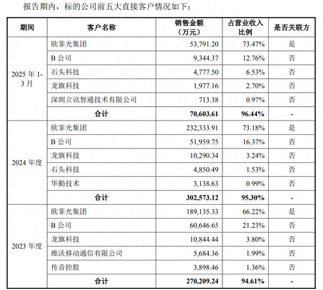 财务数据显示,标的公司欧菲微电子存在客户集中度较高的风险。2023年、2024年和2025年一季度,将上市公司及其子公司从标的公司采购后未经加工直接对外销售部分的产品穿透至外部客户后,标的公司对穿透后前五大客户的销售额占营业收入的比例分别为79.40%、78.30%、79.29%,主要包括国际国内头部智能手机品牌厂商等。而报告期内欧菲光均为欧菲微电子第一大直接客户,销售占比分别为66.22%、73.18%、73.47%。