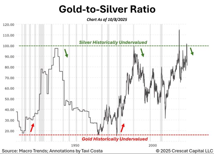 从衡量黄金与白银间相对走势的金银比指标来看,今年早些时候该指标曾一度突破了逾100倍的历史极端水平,但随着近来白银涨幅持续跑赢黄金,金银比指标已重新有所回落。