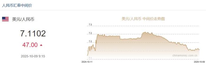 据中国外汇交易中心网站消息,中国人民银行授权中国外汇交易中心公布,2025年10月9日银行间外汇市场人民币汇率中间价为:1美元对人民币7.1102元,下调47个基点。