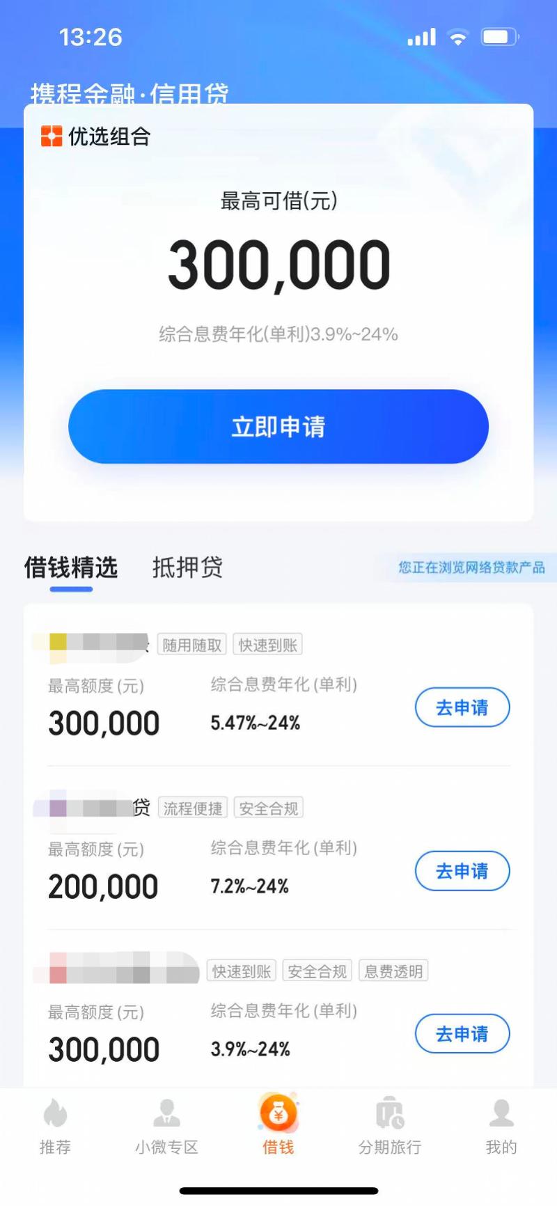 图为携程金融“优选组合——借钱精选”部分合作方状况。
